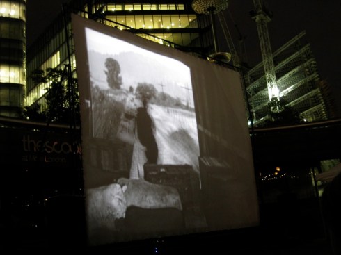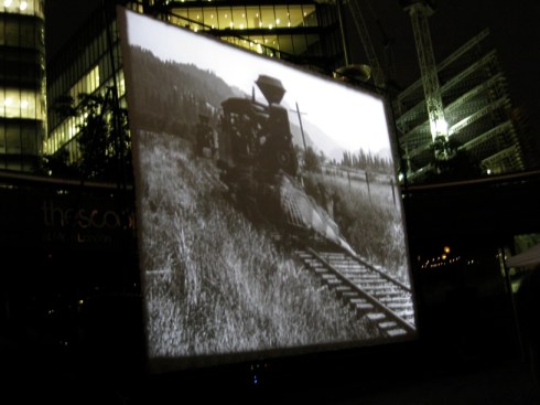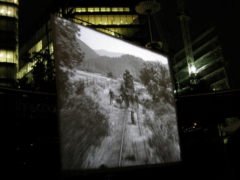 Anyone passing by could have stopped and watched The General which continued to play during the chilly night. I took these photos of the film which in some ways is quite a surreal sight: a silent playing to the city itself, and to a curious, appreciative and bewildered stream of onlookers.